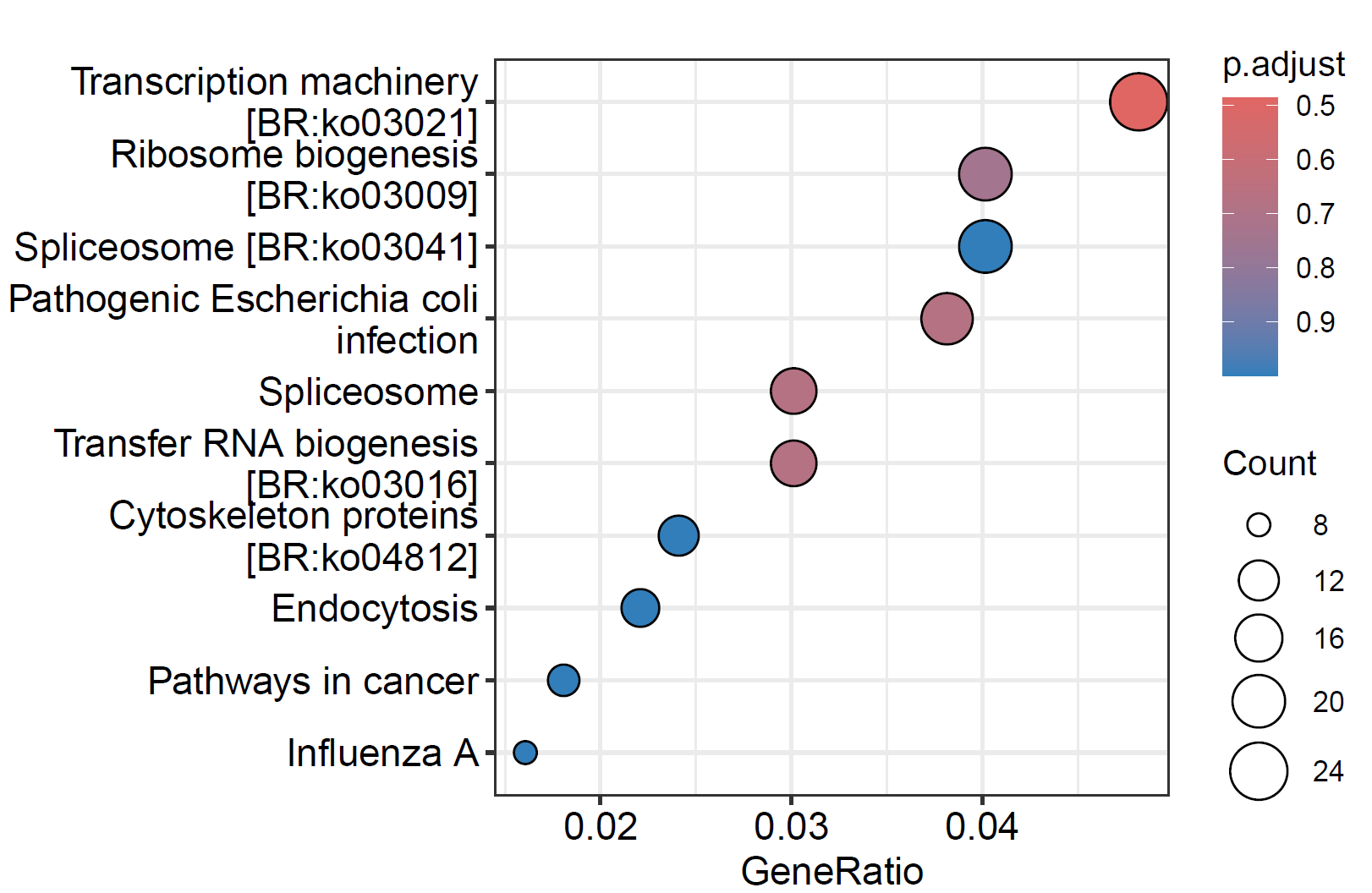pdf("./功能富集/02.kegg.气泡图.pdf",height = 4, width = 6) dotplot(kegg) dev.off()