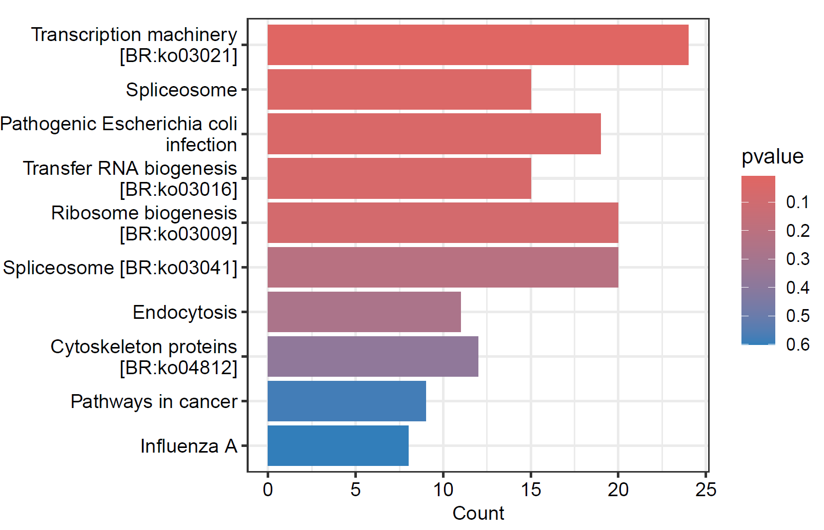 pdf("./功能富集/01.kegg.柱状图.pdf",height = 4, width = 6) barplot(kegg, showCategory= 10, drop=F, color="pvalue", font.size=10) dev.off()