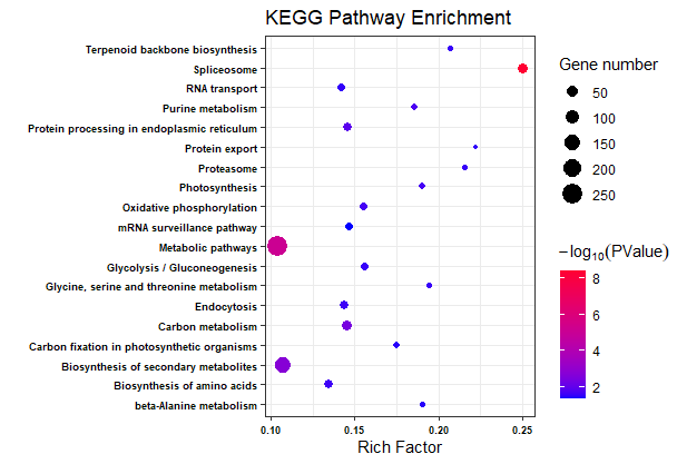 ggplot(KEGG.data, aes(x = Richfactor, y = Term))+ geom_point(aes(size = number, color = -1*log10(Corr_PValue)))+ scale_color_gradient(low = "#0000ff", high = "#ff0033")+ labs(color = expression(-log[10](PValue)), size = "Gene number", x = "Rich Factor", y = "", title = "KEGG Pathway Enrichment")+ theme(legend.background = element_blank())+theme_bw()+ ## theme_bw() 去掉背景 theme(axis.text = element_text(face = "bold",color = "black", size = 7)+ ## 修改字体大小,根据自己实际情况修改 theme( axis.text = element_text(size = 12, family = "Arial", color = "black"), axis.title = element_text(size = 14, family = "Arial", color = "black"), legend.text = element_text(size = 12, family = "Arial", color = "black"), legend.title = element_text(size = 14, family = "Arial", color = "black")) )
