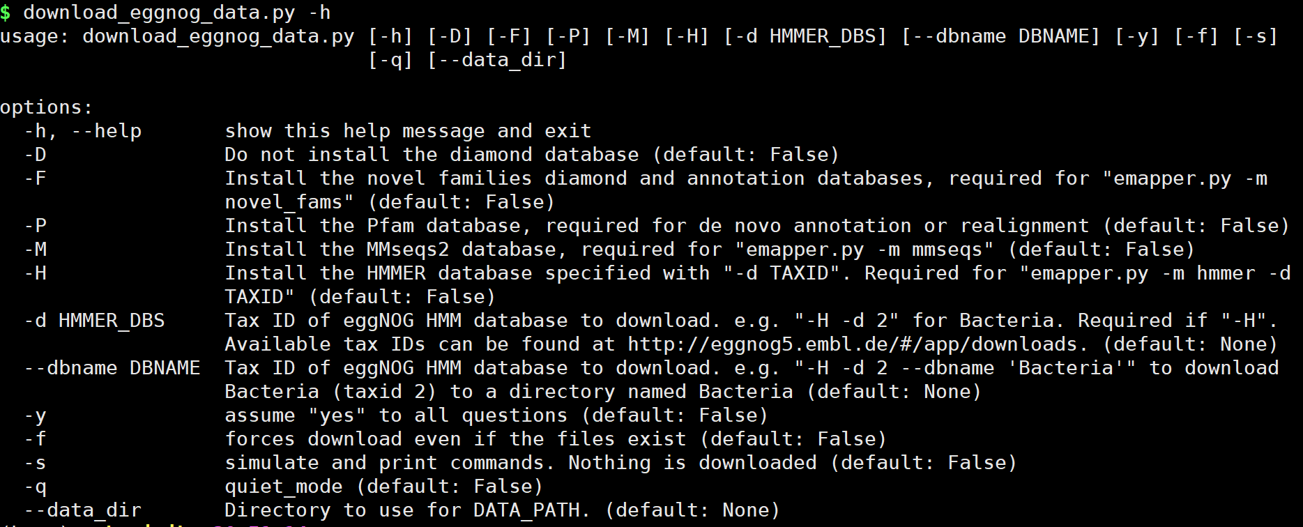 options: -h, --help show this help message and exit -D Do not install the diamond database (default: False) -F Install the novel families diamond and annotation databases, required for "emapper.py -m novel_fams" (default: False) -P Install the Pfam database, required for de novo annotation or realignment (default: False) -M Install the MMseqs2 database, required for "emapper.py -m mmseqs" (default: False) -H Install the HMMER database specified with "-d TAXID". Required for "emapper.py -m hmmer -d TAXID" (default: False) -d HMMER_DBS Tax ID of eggNOG HMM database to download. e.g. "-H -d 2" for Bacteria. Required if "-H". Available tax IDs can be found at http://eggnog5.embl.de/#/app/downloads. (default: None) --dbname DBNAME Tax ID of eggNOG HMM database to download. e.g. "-H -d 2 --dbname 'Bacteria'" to download Bacteria (taxid 2) to a directory named Bacteria (default: None) -y assume "yes" to all questions (default: False) -f forces download even if the files exist (default: False) -s simulate and print commands. Nothing is downloaded (default: False) -q quiet_mode (default: False) --data_dir Directory to use for DATA_PATH. (default: None)