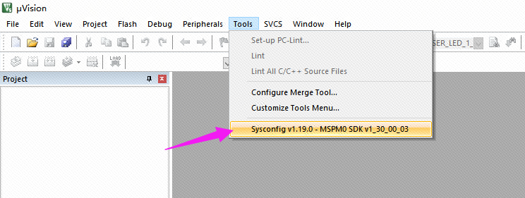 在 Keil 中启动 SysConfig 工程的最佳方式是从 SDK 将其导入;不过在首次启动时,需执行一些步骤以在 Keil 中初始化 SysConfig。