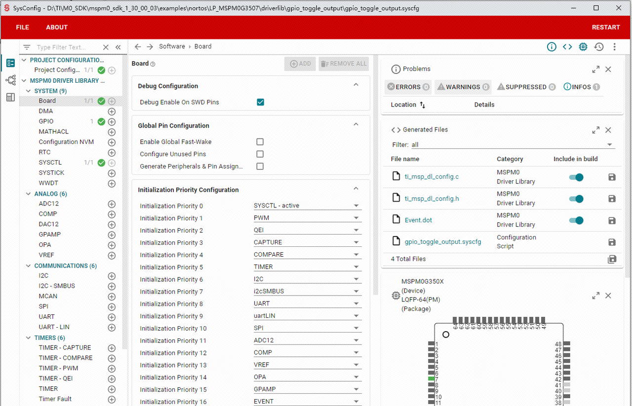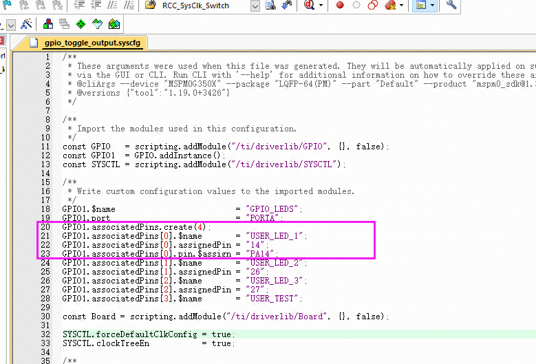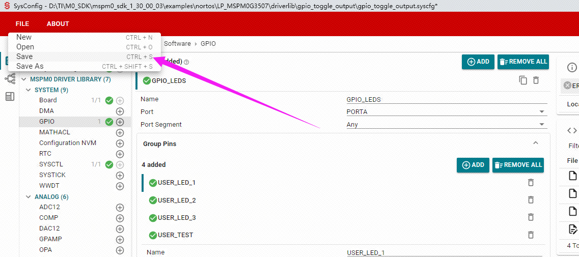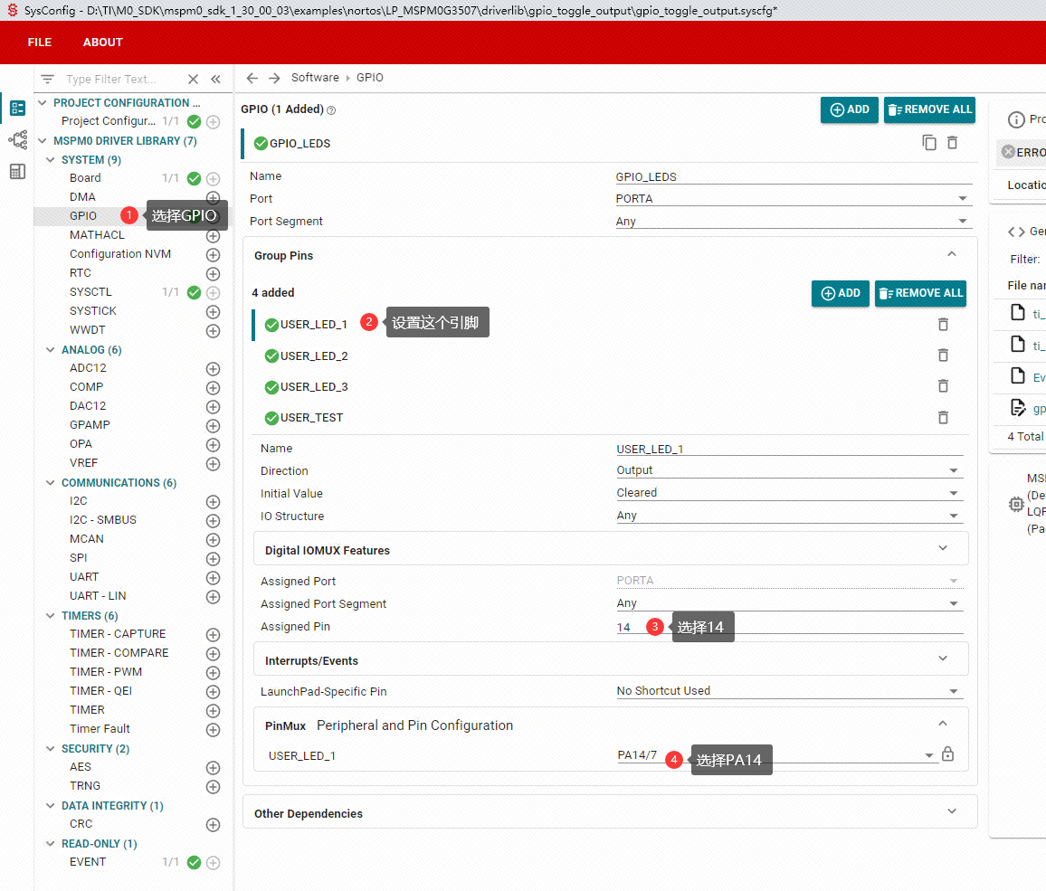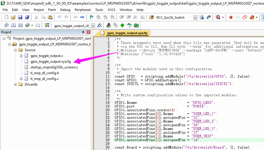 在打开的工程中,找到gpio_toggle_output.syscfg文件,并且打开。