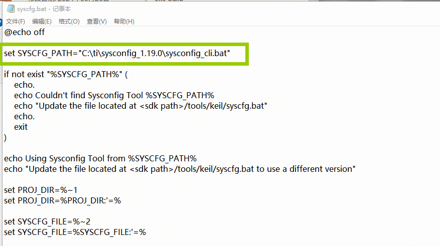 修改下面以绿色显示的 SYSCFG_PATH,以匹配在我们之前安装SYSCFG的路径。这个直接搜sysconfig_cli.bat再复制文件地址