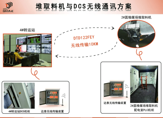 实例赏析:斗轮机无线联锁通讯系统取代线缆,避免斗轮机作业故障频发以及维修更换耗时高成本的情况,圆堆厂房内的堆取料机担负着储存、输送原料的重要任务,要实现由2号圆形煤场堆取料机配电室PLC机柜内开关信号无线传输至4号转运电子间DCS机柜,包含允许堆料、允许取料、外围取料运行、堆取料机紧急停机等8路指令信号,及堆料运行、堆料故障、取料故障、取料回路等16路反馈信号,无线传输距离10公里。从而实现无线控制堆料、取料。