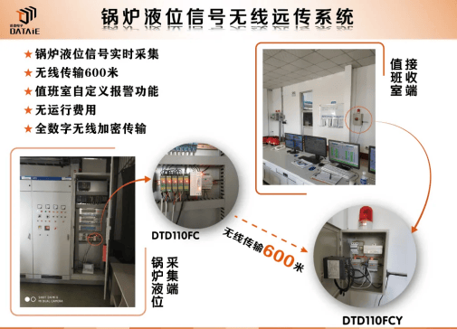 实例赏析:将厂区内检测锅炉液位的流量计信号采集至约600米远的值班室内,锅炉的液位值实时在数显表上显示,并能够在规定液位值触发报警灯报警。由于厂区面积较大,厂房较多,若采用有线方式施工成本高,周期长,故考虑采用无线的方式完成两个分散区域模拟量数据的无线传输。分别在锅炉流量计旁安装一块DTD110FC——达泰无线模拟量传输器作为发射端采集锅炉液位信号;在值班室内安装一台DTD110FCY——达泰无线模拟量传输装置(配有数显表及报警灯)作为接收端,可在数显表上实时显示锅炉液位情况,并在规定液位值报警(该液位值由用户设定)。