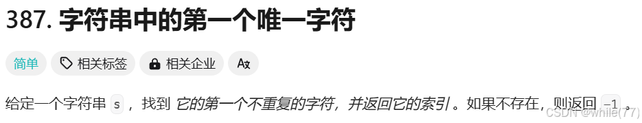 这道题是只包含小写字母的,所以我们可以想到,创建一个大小为26的整型数组,用一个下标代表一个字符,下标 = 字符 - ‘a’,然后遍历一遍字符串s,统计出每个字符出现的个数,完成之后,再遍历一次字符串s,如果遍历到的字符对应的下标的值是1,就代表这个字符再字符串中只出现了1次,也就是结果