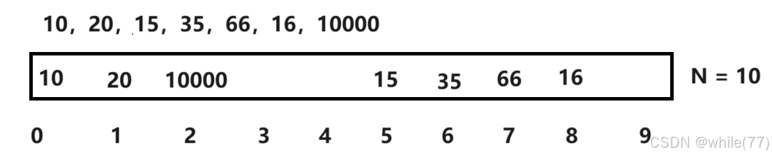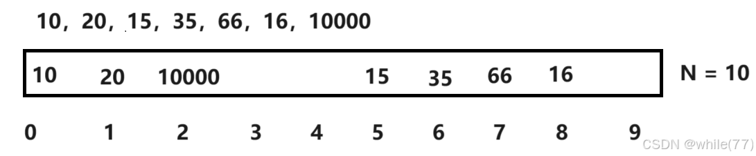 上面的数据10,20,15,35,66,16,10000,使用开散列就是