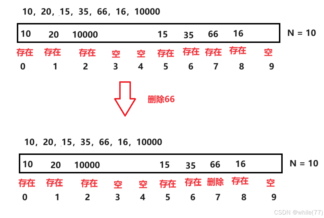 此时如果再查找16,会发现表中有16,但是找不到。所以,表中存数据时,每个位置不应该只存数据,还应该存放这个数据的状态。数据的状态有3种:存在、不存在、删除。此时也需要修改一下上面的查找和删除逻辑。查找除了要比较值是否相同,并且还需要这个值的状态是存在,才算找到,找不到时,是从映射的位置一直向后找,直到状态为空,才算找不到,如果遇到状态是删除的,仍然需要向后找。删除可以不改变这个结点的数据,只需要将这个结点的状态改成删除即可