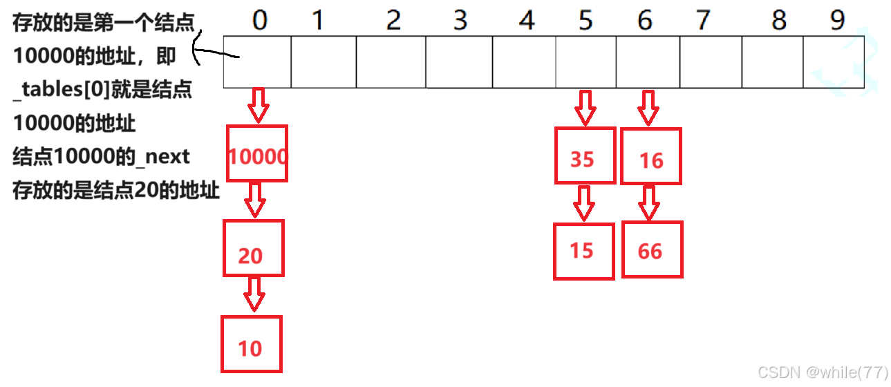 这里的哈希表就是一个指针数组,下面挂着的就是链表,所以结点除了要存储值,还要存储下一个结点的地址。每一个链表称为一个哈希桶