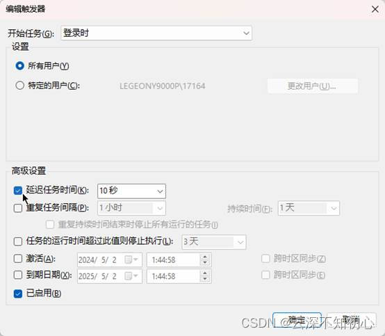 此时,虽然任务计划程序的优先级仍旧比显示器缩放优先级高,但程序会在登录到用户10秒后启动,由此就可以解决问题。