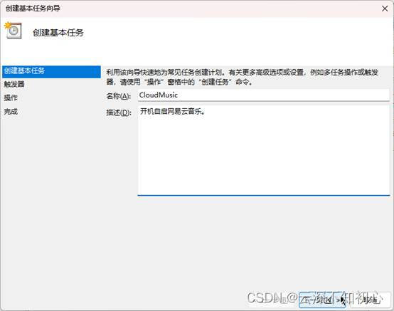4.以制作开机自启的网易云音乐任务为例,在任务名称中输入“CouldMusic”,描述中输入“开机自启网易云音乐”。