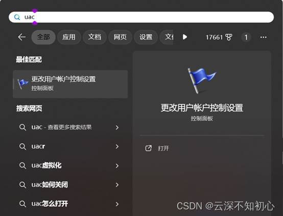 2.点击推荐搜索中的“更改用户账户控制设置”(或直接在控制面板中找到)