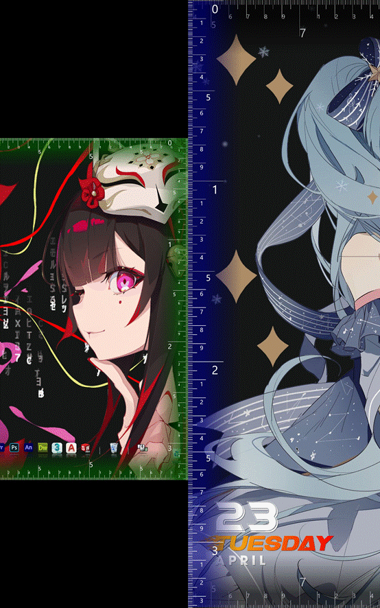 在这里,我是通过截屏软件同时截取了两个屏幕的图片;其中,紫色标尺所对应的就是左侧的大屏幕(2560×1440屏幕),绿色标尺所对应的就是右侧的小屏幕(1600×2560的屏幕)。我们要做的就是将这两个屏幕相邻边所对应的标尺,通过拉伸,使得其二者的读数相一致(比如上图中,左侧和右侧标尺的1相对应,2相对应,以此类推。