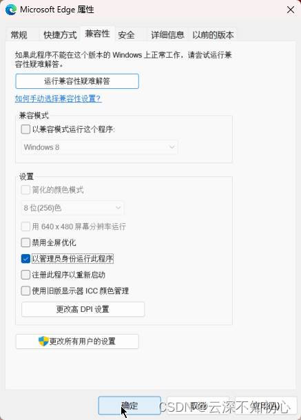 这样设置后,每次双击运行该程序时都会默认以管理员身份运行。