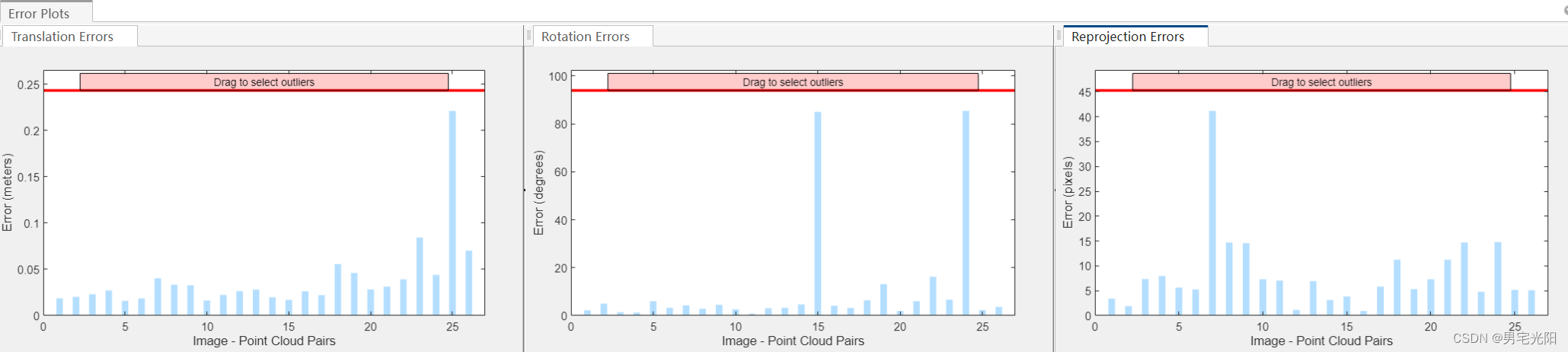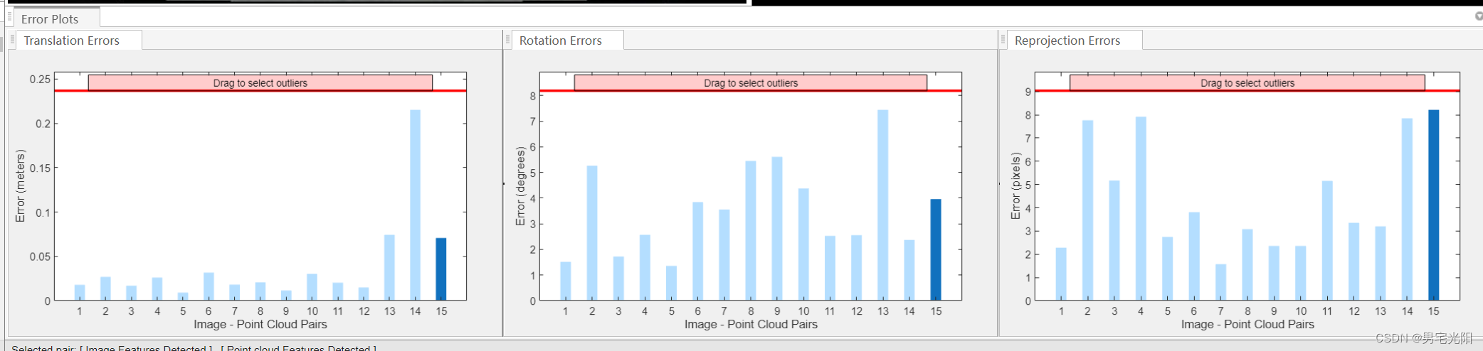 点击柱状线,或者拖动离群值可以选择抛弃的数据。最好一个个的删除误差比较大的数据,因为删除一个数据都可能导致整个误差有很大的波动。优先删除重投影大的数据同时旋转误差大的数据,没有这类数据就删除重投影误差大的数据。