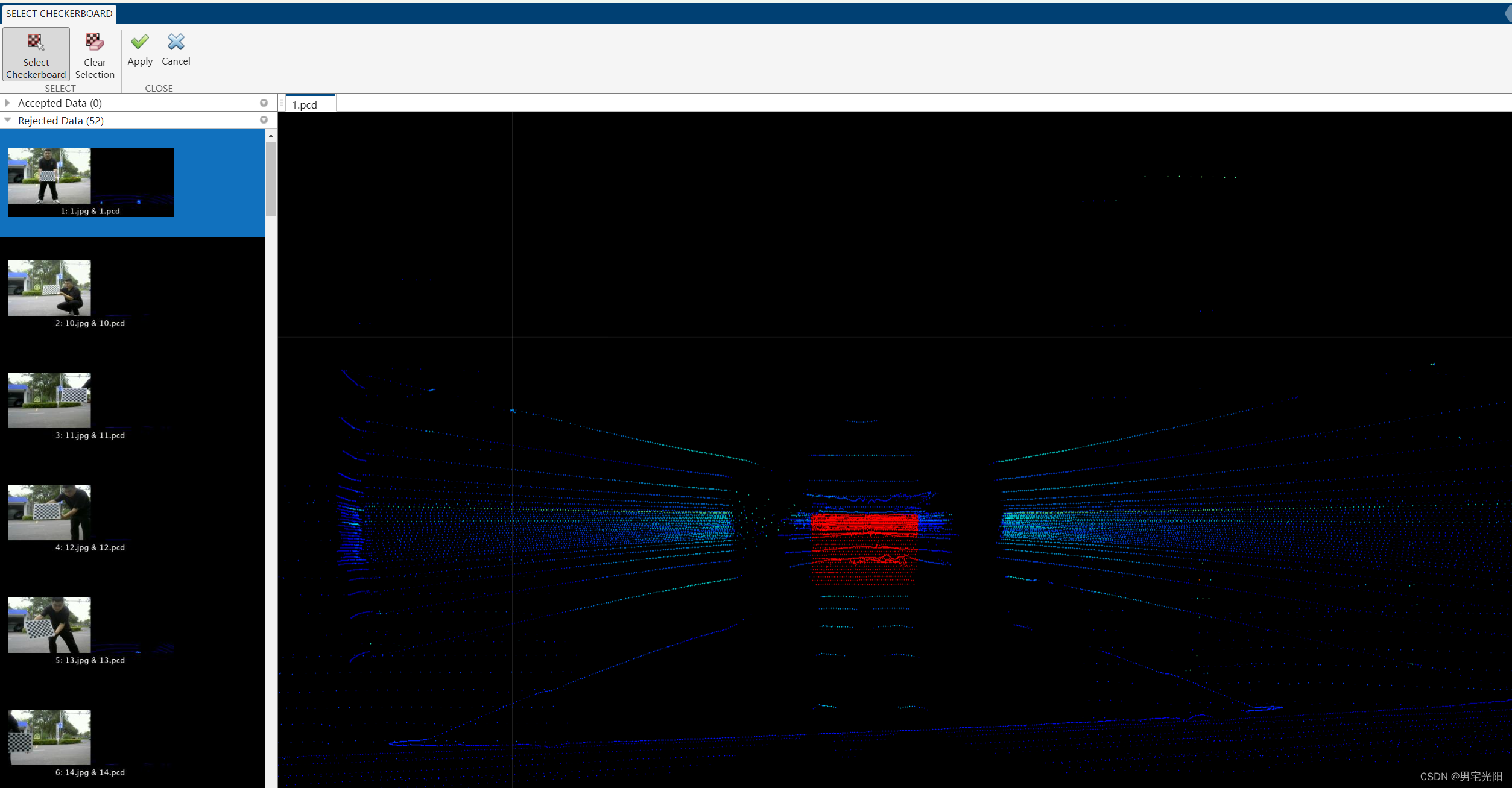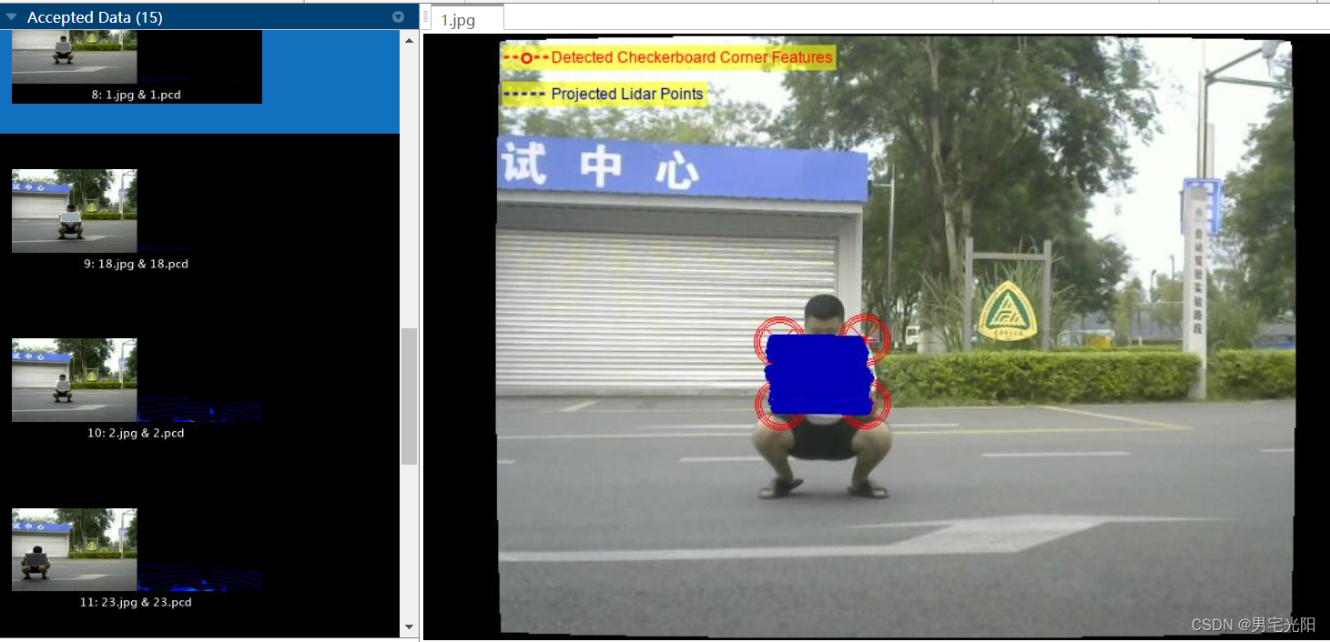 Select Checkboard:选择棋盘格,导入数据后会有很多不符合要求的图像点云对,此时需要手动选择棋盘格,相当于告诉标定工具,棋盘格在哪。(这一步尤为关键!!)