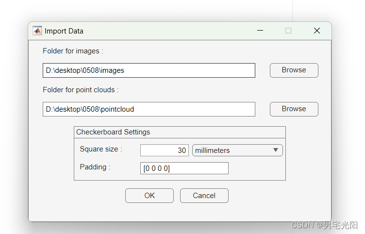 (1)导入数据,Square size是标定板的每格的长宽大小。