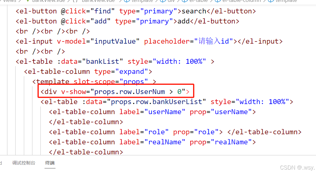因为UserNum也是计算得到的,所以不能和别的列一样直接从对象中获取,想了很多种方法tree-props属性还是v-if都不行,但是解决方法其实很简单,就是下拉列代码内部加一层div嵌套在template内部,再使用v-show,直接判断每一行(记录/对象)所包含的对象数组的长度即可,而并不能根据UserNum来判断