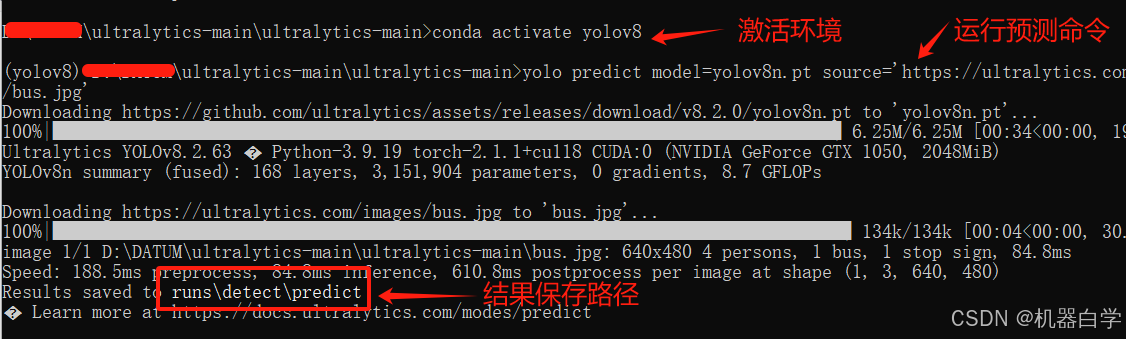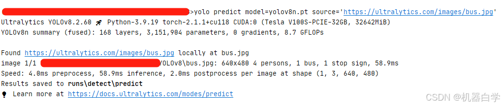 # 环境安装测试指令 yolo predict model=yolov8n.pt source='https://ultralytics.com/images/bus.jpg'