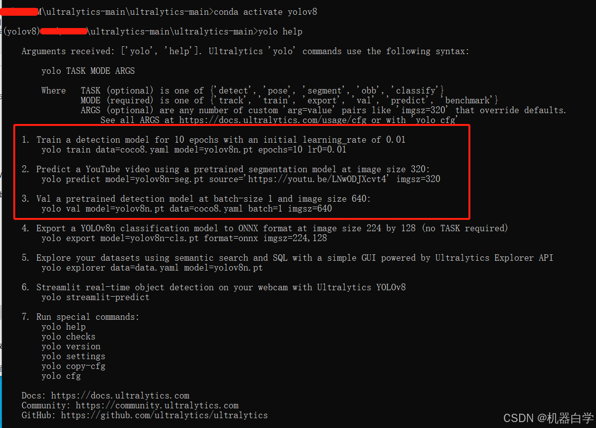 进入源码下载地址,激活环境后使用命令行可以获取yolov8使用的参考命令代码。其中的示例给出yolo基本的训练、预测、验证使用方法。