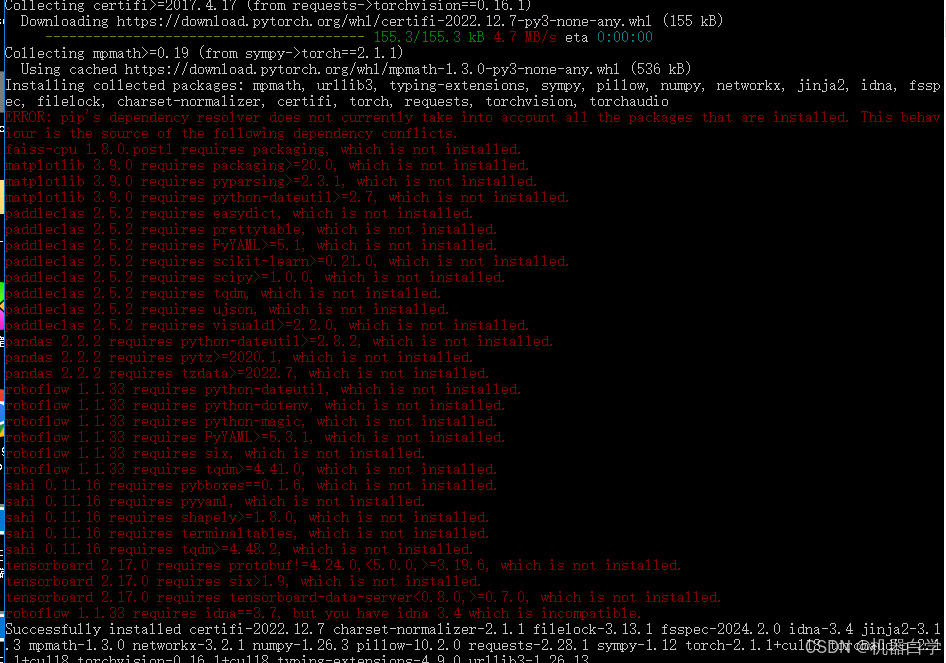 安装 pytorch 过程中遇到一个红字报错,一些依赖库没有安装,本人选择粗糙的pip安装所有解决。
