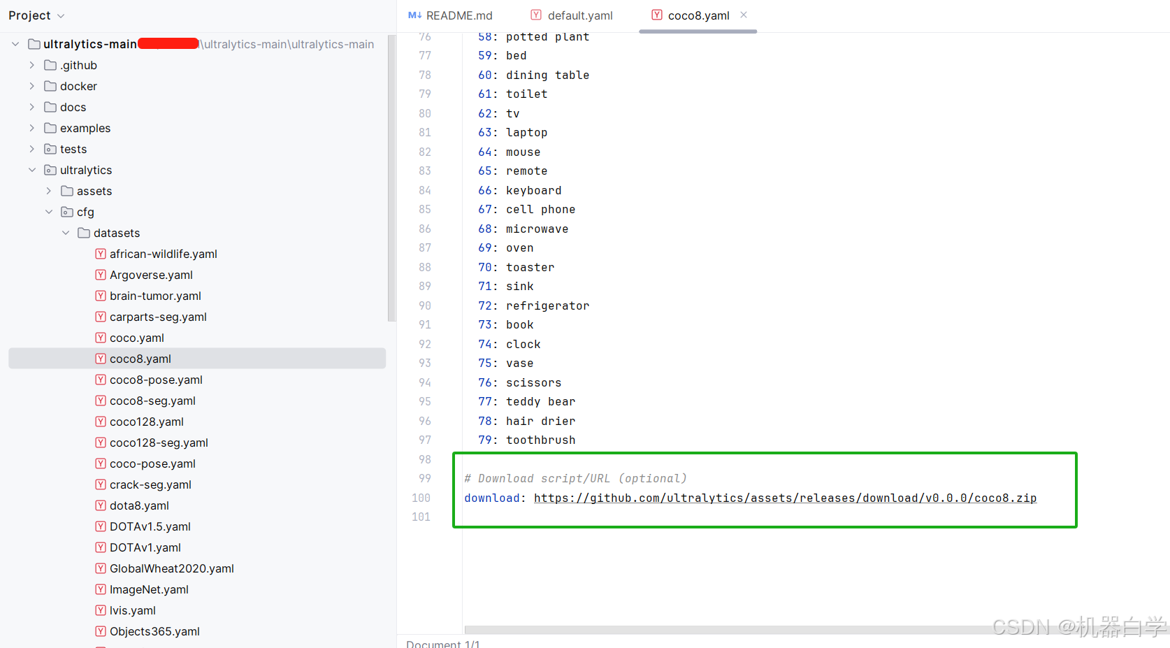 在coco8.yaml的末尾可以看到 download 参数,表示当前数据集是在线下载的,如果要使用网上的数据集,如从GitHub上下载的数据,也可在此处修改地址。