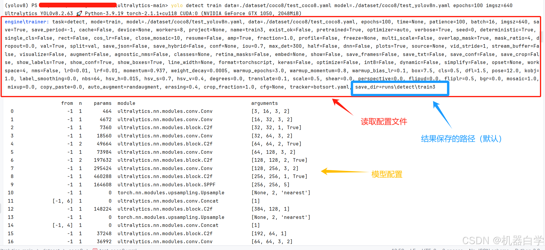 根据其源码注释,可知,可以通过调整yolo命令行指令输入来选择不同大小的模型,只需在yolov8.yaml 后缀前添加所需模型的简称即可。下面的例子解释了这一问题,也就是说下面指令使用的都是同一个配置文件,即/ultralytics-main/ultralytics/cfg/models/v8/yolov8.yaml。