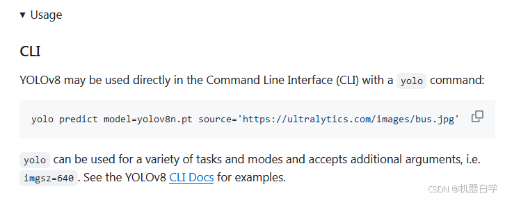 yolov8官方文档中介绍了其模型的命令行指令使用方式(command line interface:CLI),参考文档地址:CLI guide