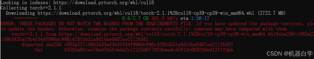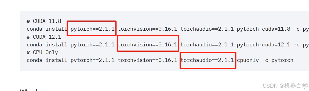# pip安装pytorch环境 pip install torch==2.1.1 torchvision==0.16.1 torchaudio==2.1.1 --index-url https://download.pytorch.org/whl/cu118