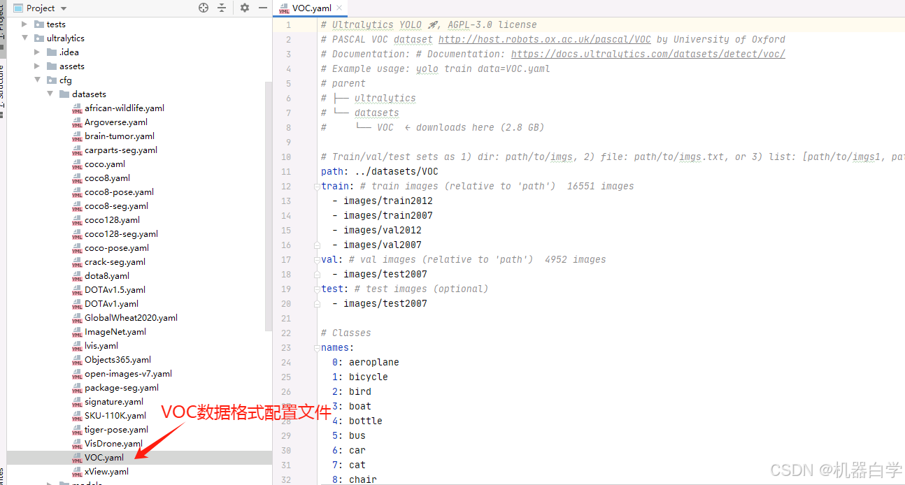 如果使用的不是coco的数据格式,同样可以参见源码地址 /ultralytics-main/ultralytics/cfg/datasets 下的数据集配置文件,yolov8支持多种输入格式。