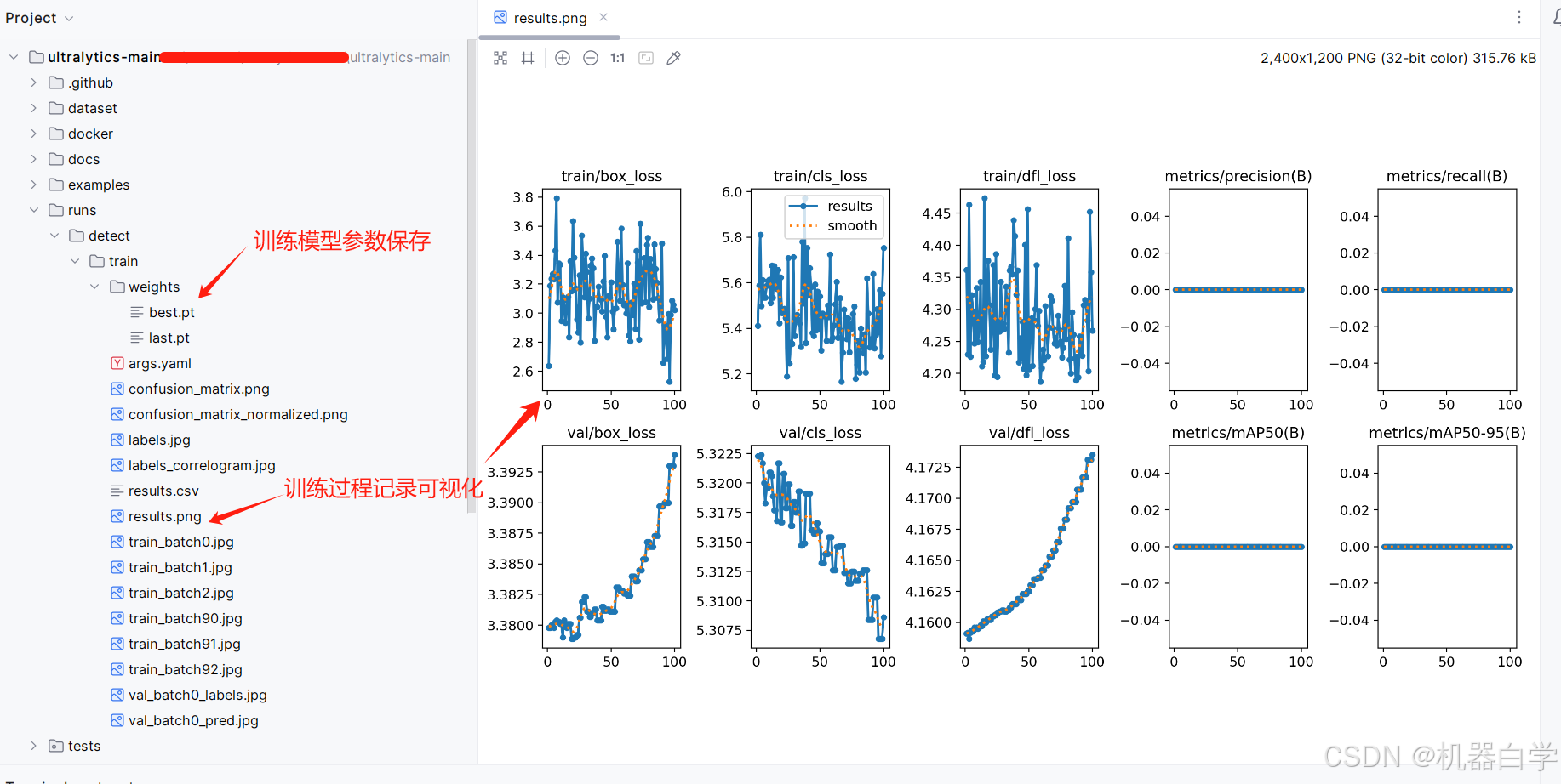 训练完成后会在主目录下新建一个 runs 的文件夹保存模型参数以及训练过程的可视化和各种评估训练的结果文件(也可以在配置中修改结果保存路径)。显而易见官方给的训练图片实在是太少了(只有四张),训练效果很差。