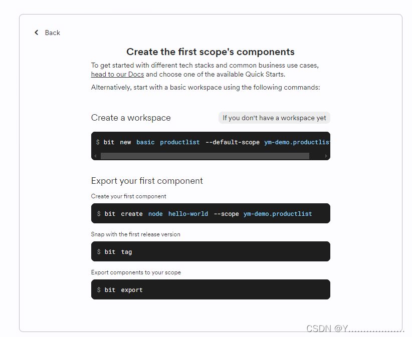bit init // 初始化bit环境 bit add ./src/components/product-list // bit会跟踪组件对组件的依赖进行分析, 将会创建一个和文件名一样的组件(product-list为文件夹名称) bit status // 查看组件状态 bit compile // 编译组件 bit install // 安装依赖 bit build // 打包 bit tag ym-demo.demoapp/product-list --ver 0.0.1 // 确认组件的版本 bit export ym-demo.demoapp/product-list // 导出到远程