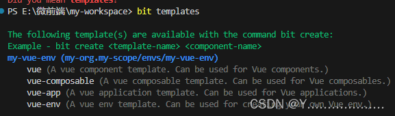 // 创建一个包含自定义Vue 环境的新工作区 bit new vue my-workspace --env bitdev.vue/vue-env --default-scope my-org.my-scope // 现有工作空间中创建自定义Vue环境: bit create vue-env envs/my-vue-env --aspect bitdev.vue/vue-env