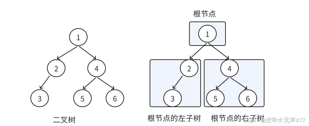 根节点的左子树和右子树分别有是有子树节点、子树节点的左子树和右子树组成,因此二叉树定义是递归式的,后续链式二叉树的操作中基本都是按照该概念实现的!!