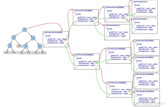 销毁的逻辑也十分的简单了,通过了递归的操作,我们遍历所有不为NULL的节点并销毁,这里我们就直接写出代码,大家可以自己进行递归栈帧的推理: