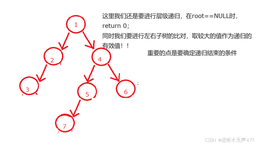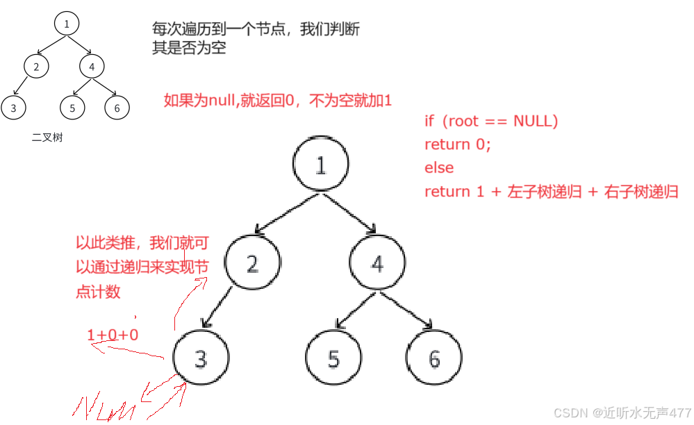 所以在这里我们就有两种返回情况,当遍历到NULL时,我们返回0, 当递归到叶子结点时,我们就返回1。借助函数栈帧,就可以进行计数!!