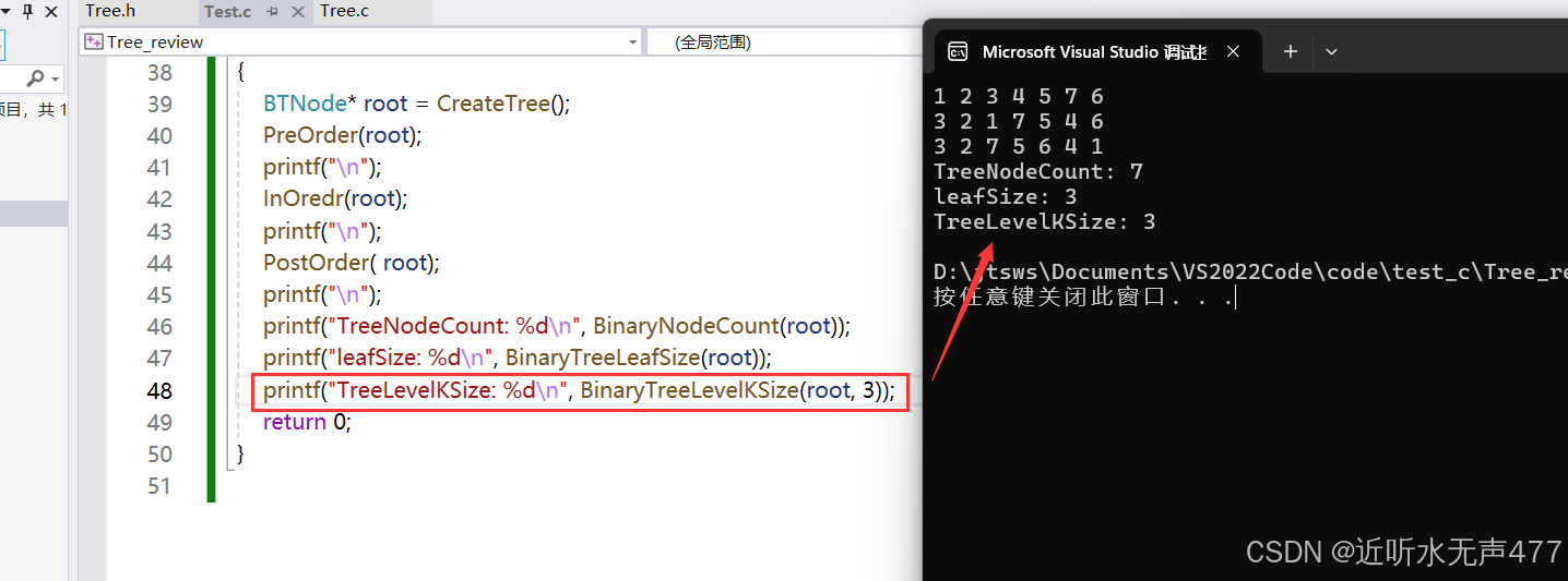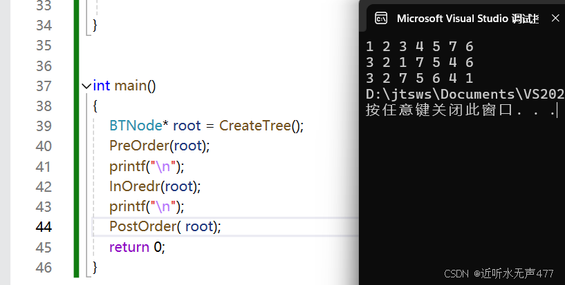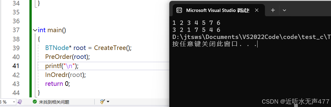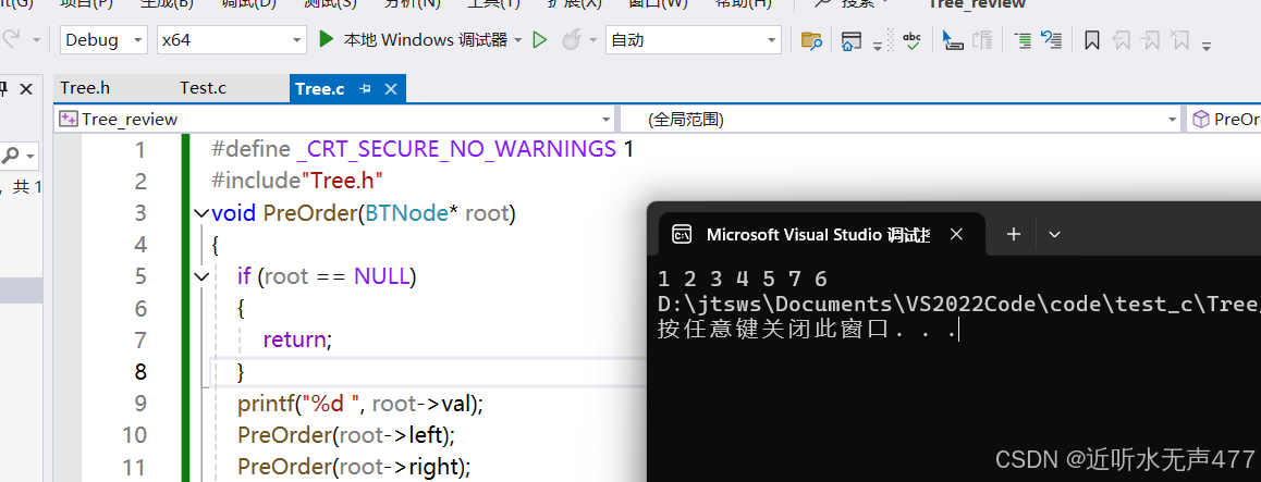 可知这符合我们前序遍历的规则,因此我们就成功实现了前序遍历。