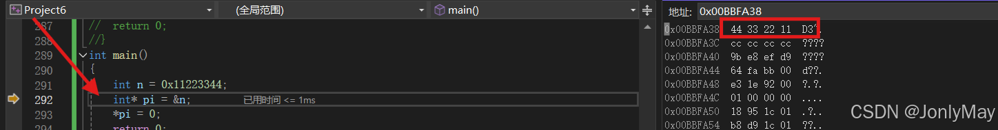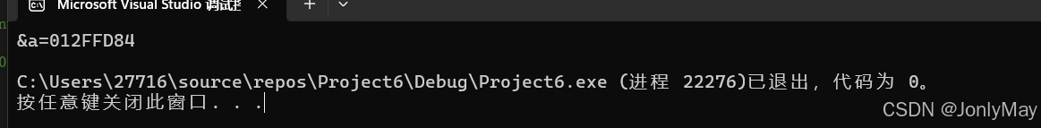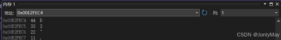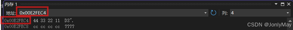还记得前面调试的时候我们是怎么观察地址的吗?我们通过输入&a按下回车后出现了0x00E2FEC4,因此0x00E2FEC4便是a的地址,我们也可以发现这个地址和 44 所占字节的地址一样。