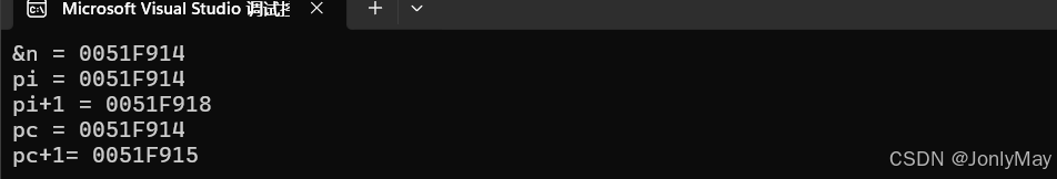int main() { int n = 0x11223344; int* pi = &n; char* pc = &n; printf("&n = %p\n", &n); printf("pi = %p\n", pi); printf("pi+1 = %p\n", pi+1); printf("pc = %p\n", pc); printf("pc+1= %p\n", pc+1); return 0; }