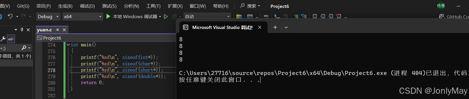 我们可以看到,不管指针类型是什么,都不会影响指针变量的大小,指针类型的变量大小,在相同平台下,大小都是相同的。