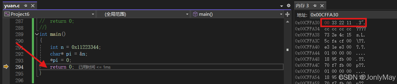 我们可以看到int类型指针可以访问4个字节,而char类型指针只访问了1个字节。
