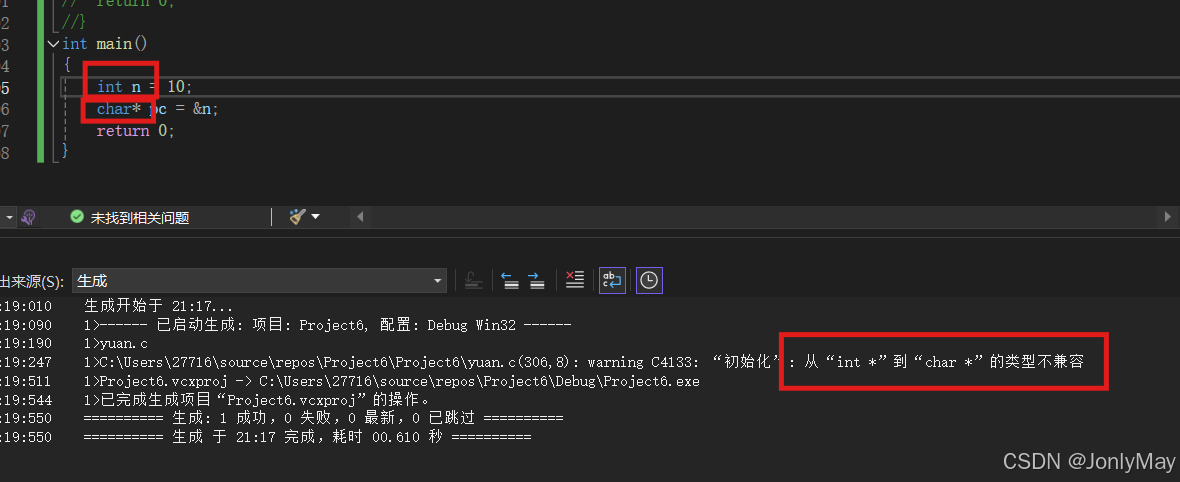 在上面的代码中,将⼀个int类型的变量的地址赋值给⼀个char*类型的指针变量。编译器给出了⼀个警告(如下图),是因为类型不兼容。而是用void*类型就不会有这样的问题。