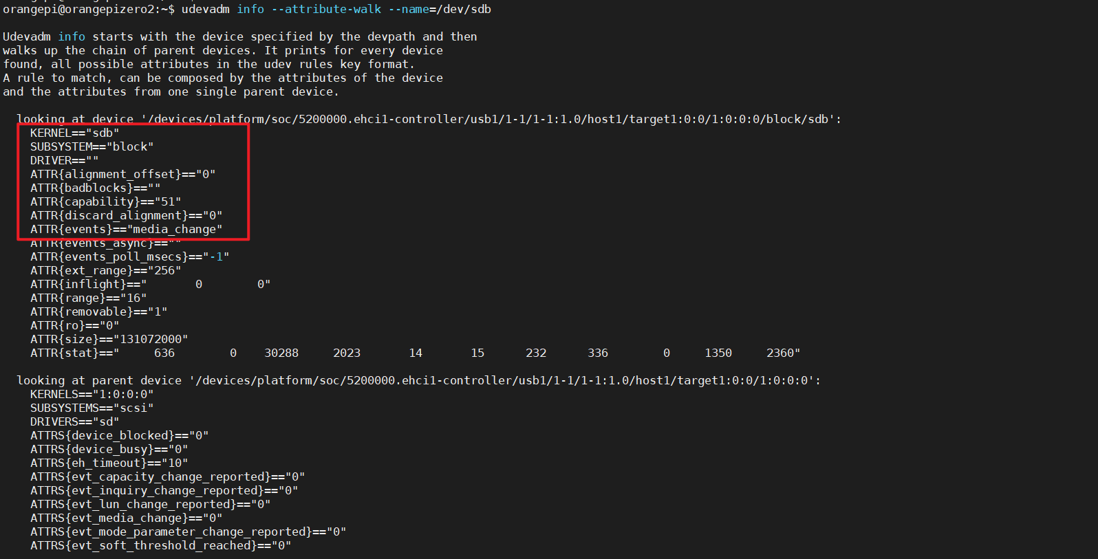 输入命令udevadm info --attribute-walk --name=/dev/sdb