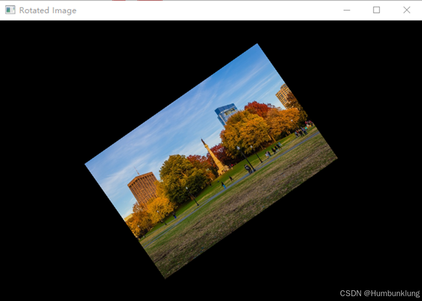# 图像旋转 import cv2 # 读取图像 img = cv2.imread('park.jpg') # 旋转图像 (rows, cols) = img.shape[:2] M = cv2.getRotationMatrix2D((cols/2, rows/2), 35, 0.5) rotated_img = cv2.warpAffine(img, M, (cols, rows)) # 显示旋转后的图像 cv2.imshow('Rotated Image', rotated_img) # 等待用户输入并关闭窗口 cv2.waitKey(0) cv2.destroyAllWindows()