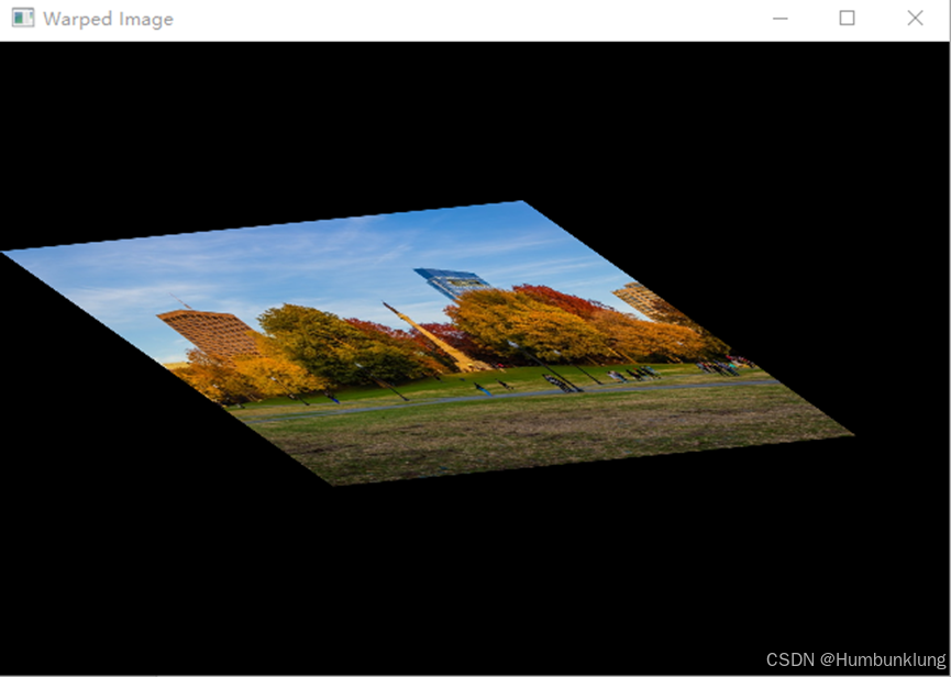 # 图像扭曲 import cv2 import numpy as np # 读取图像 img = cv2.imread('park.jpg') # 图像扭曲 (rows, cols) = img.shape[:2] srcTri = np.array( [[0, 0], [img.shape[1] - 1, 0], [0, img.shape[0] - 1]] ).astype(np.float32) dstTri = np.array( [[0, img.shape[0]*0.33], [img.shape[1]*0.55, img.shape[0]*0.25], [img.shape[1]*0.35, img.shape[0]*0.7]] ).astype(np.float32) M = cv2.getAffineTransform(srcTri, dstTri) warped_img = cv2.warpAffine(img, M, (cols, rows)) # 显示旋转后的图像 cv2.imshow('Warped Image', warped_img) # 等待用户输入并关闭窗口 cv2.waitKey(0) cv2.destroyAllWindows()