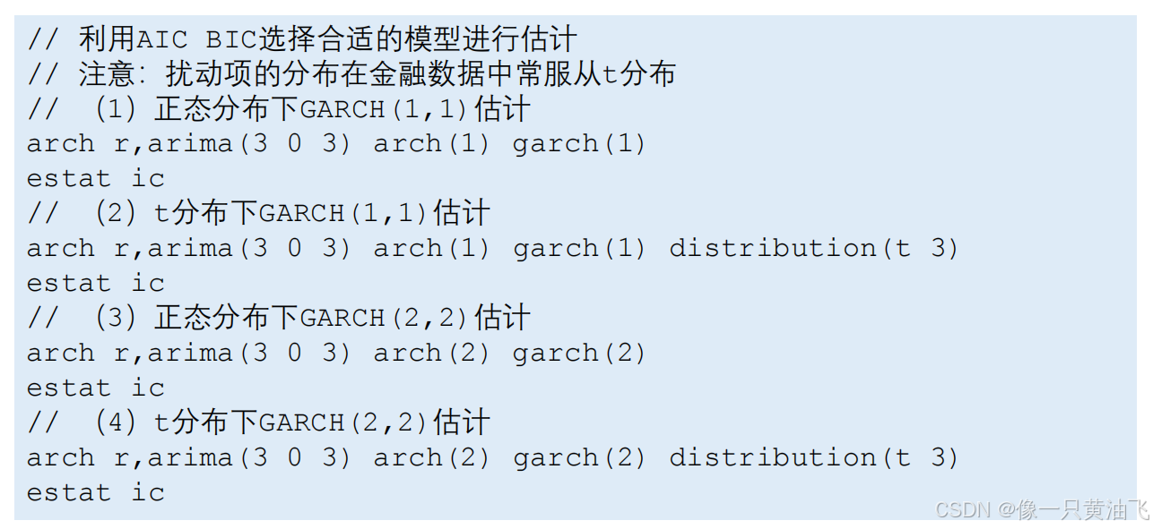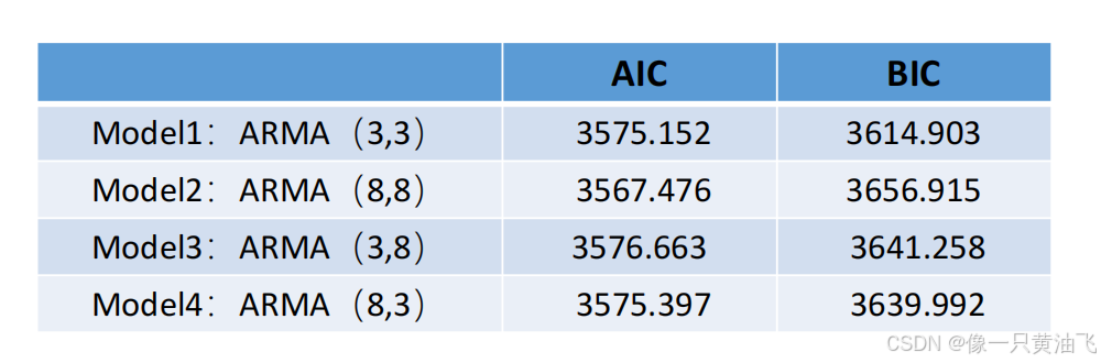 太多的滞后项会增加预测的误差,太少的滞后项又会遗失部分相关信息。经验和理论知识通常是用来决定滞后项阶数的最好方式,然而,依然存在着一些准则帮助我们确定滞后的阶数。为了确定哪个模型拟合效果最好,我们分别估计出了这四种模型,并给出了对应的AIC和BIC值,我们认为AIC与BIC值较小,模型拟合效果较好。