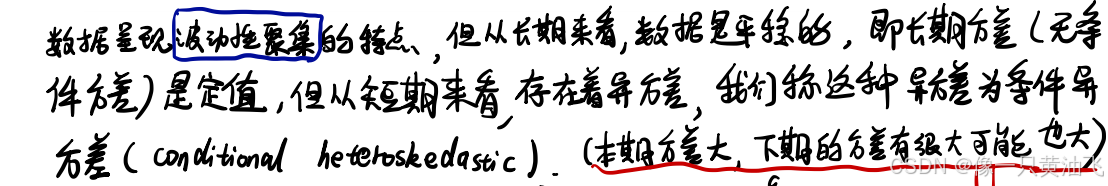 数据呈现波动聚集性(volatility clustering)长期来看时间序列平稳,短期来看不平稳,存在异方差