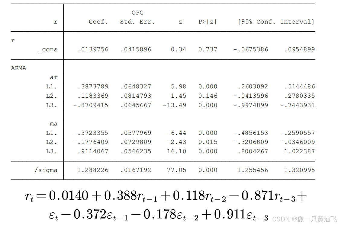 通过比较AIC和BIC,最终我们选择使用带有GARCH(1,1)且 vt服从t分布的扰动项的ARMA(3,3)模型进行估计。