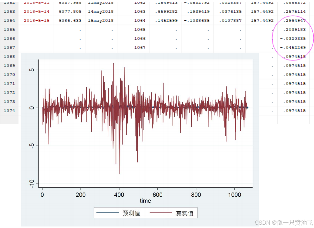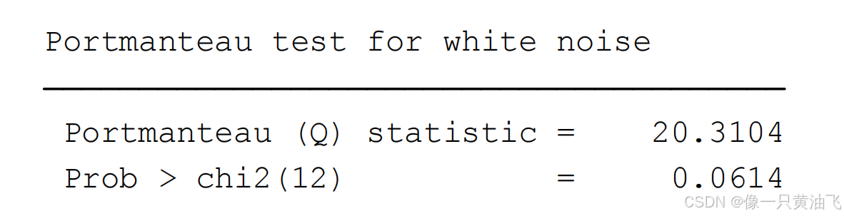 滞后12项的检验值的P值大于0.05,在5%的显著性水平下并不能拒绝原假设。故可以认为通过白噪声检验,即我们认为回归得到的残差不存在较明显的相关性,因此模型有效性较好。