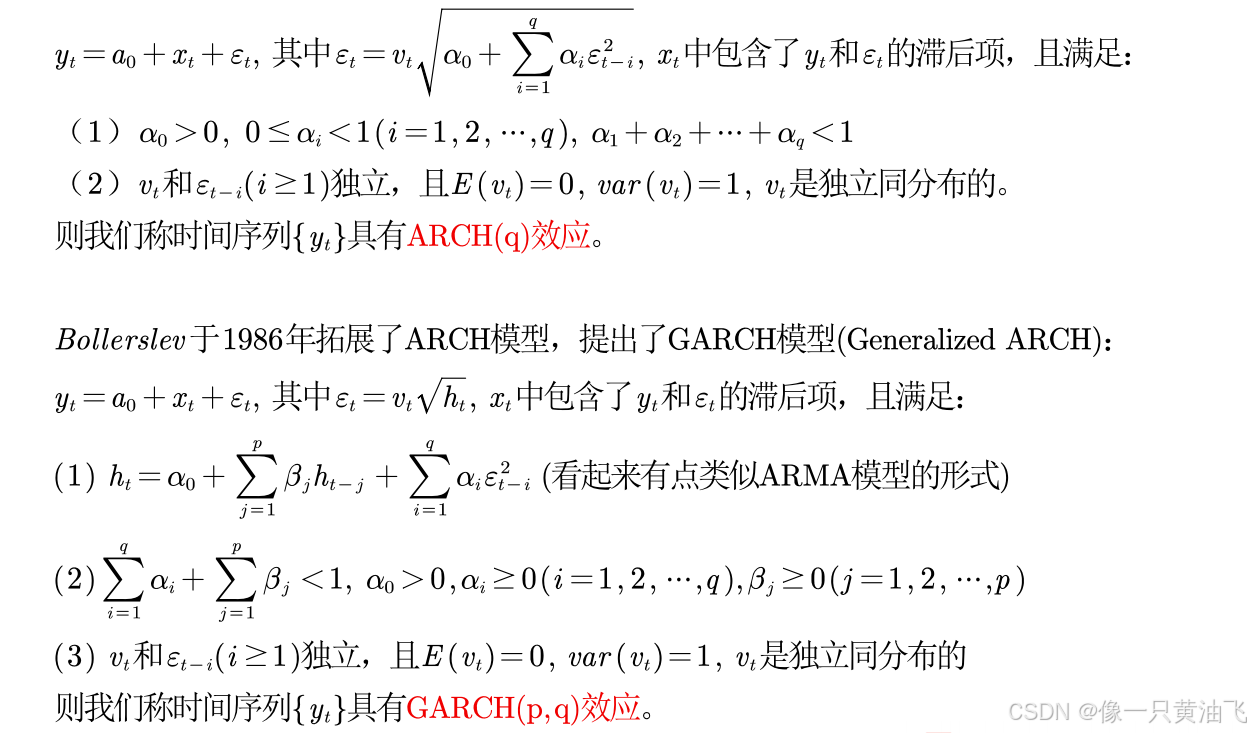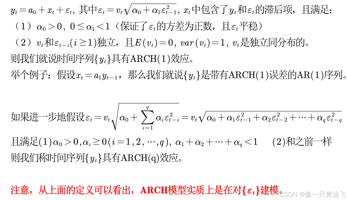 因为加法条件异方差的性质不容易探究,因此我们所说的ARCH模型均是下面的乘法条件异方差模型。另外,大家可以看出,实际上ARCH模型是在ARMA模型的基础上提出来的,两者的区别在于扰动项的设置不同,在ARMA模型中扰动项是最简单的白噪声序列。